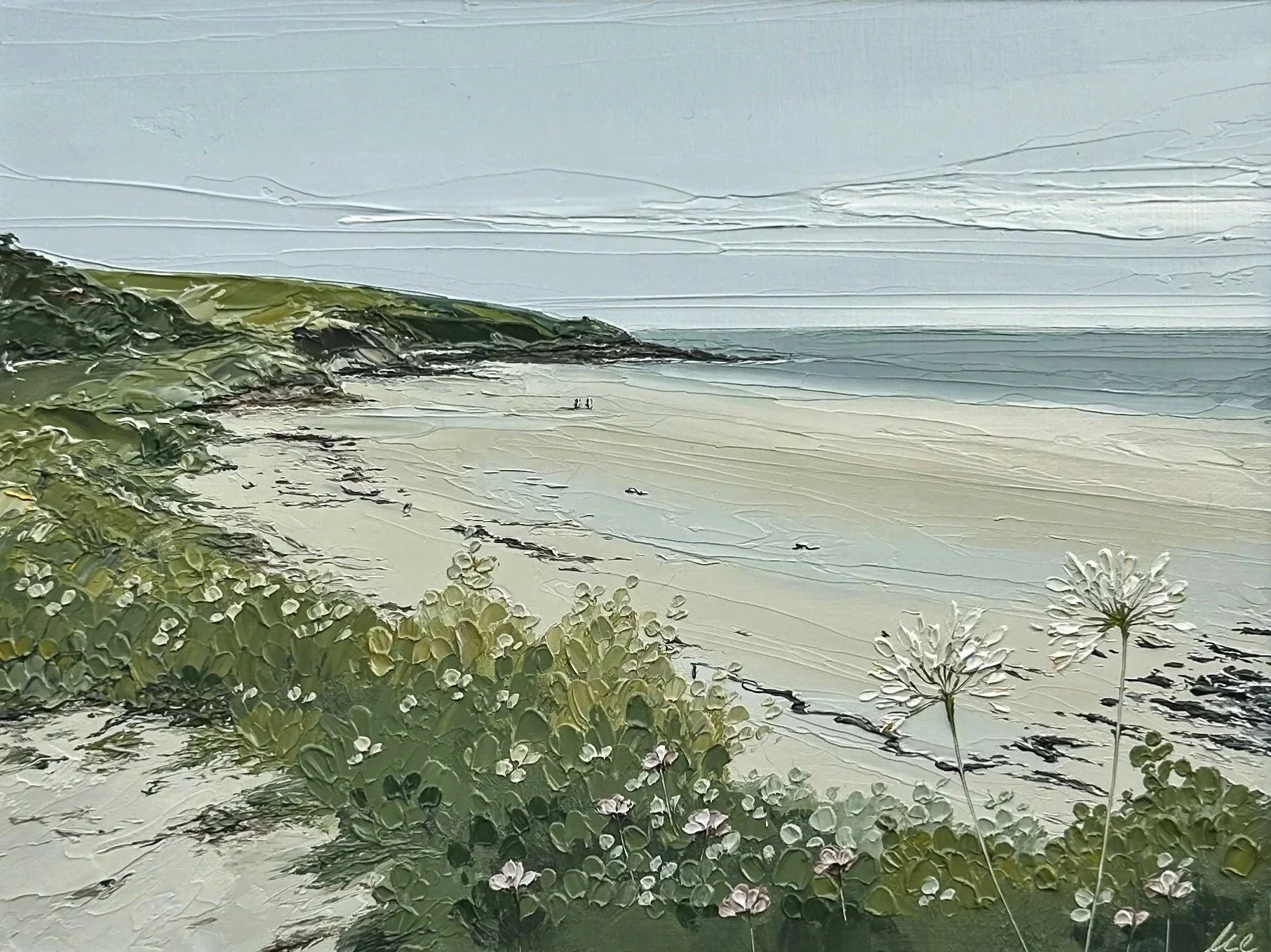 Katie's paintings often depict delicate wildflowers in the foreground and tiny figures on the sand, giving the sense of a windswept moment along the coastpath and an emotional familiarity with the scene.