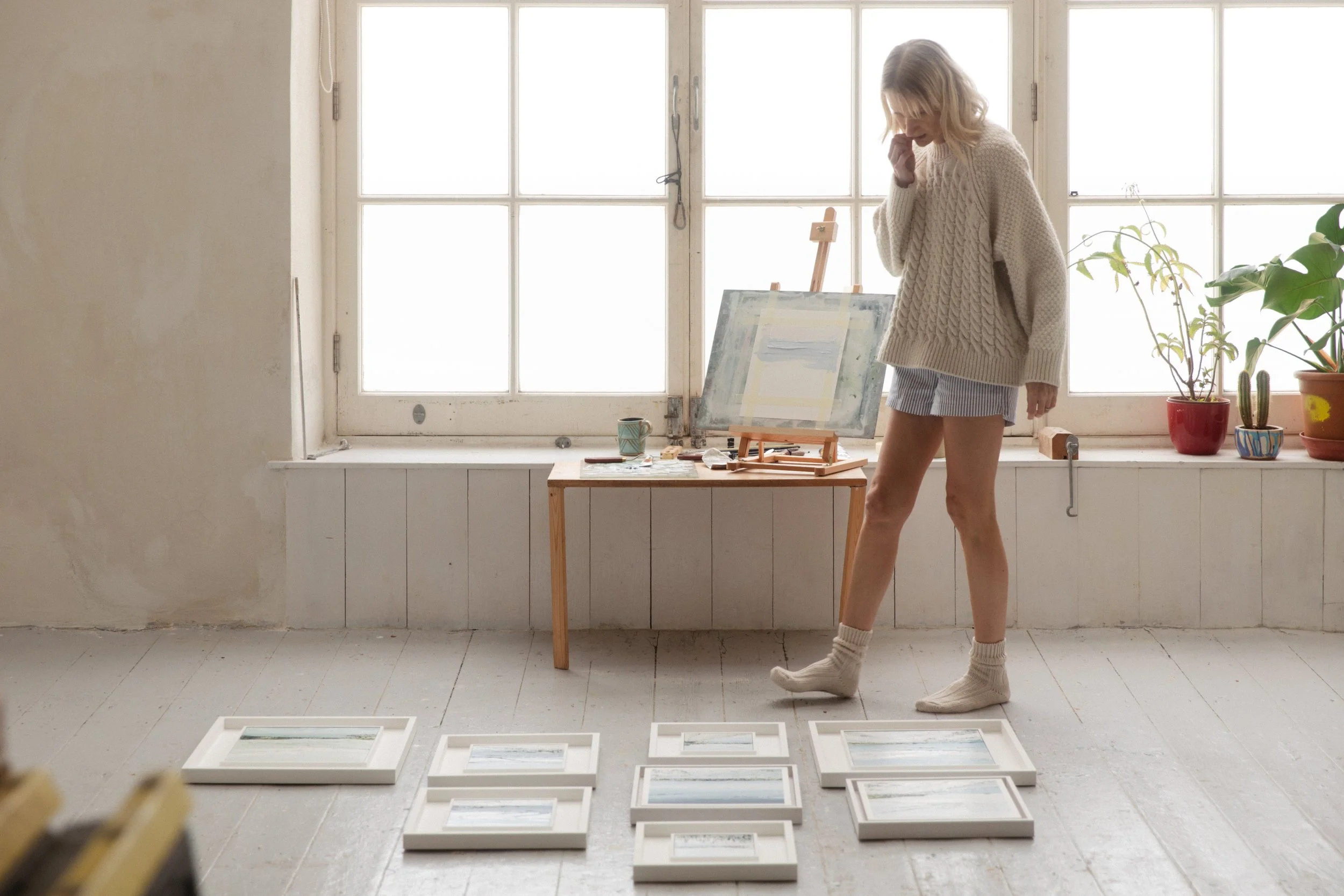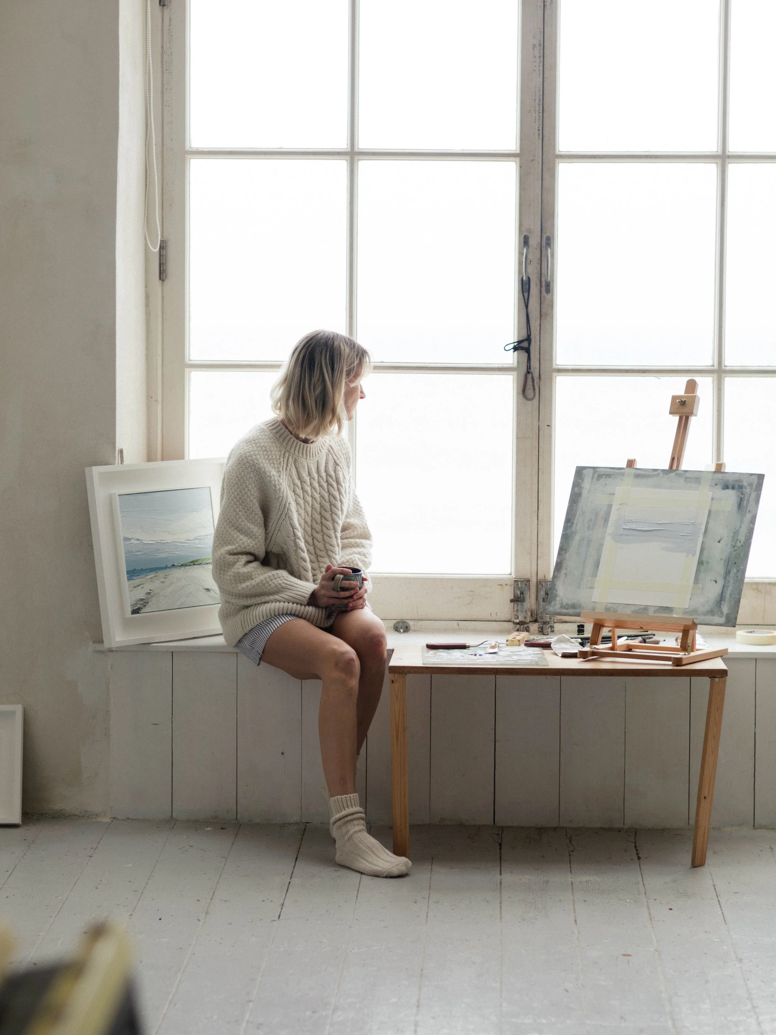 Beautifully capturing the quiet serenity of the coastal landscape, Katie uses a harmonious palette of blues, greens and earthy tones to create calm scenes with soft, expansive skies and delicate cloud formations that blend seamlessly into the horizon.